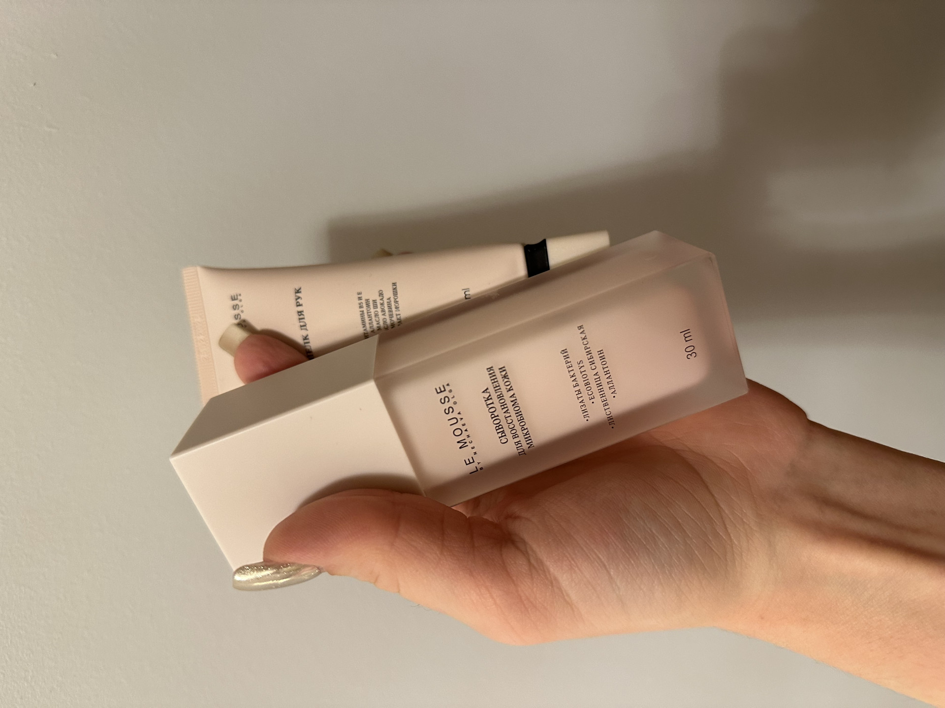 Сыворотка для восстановления микробиома содержит в составе лизаты «хороших» бактерий, пребиотики, а также биопептиды, способствующие запуску естественных процессов кожи.